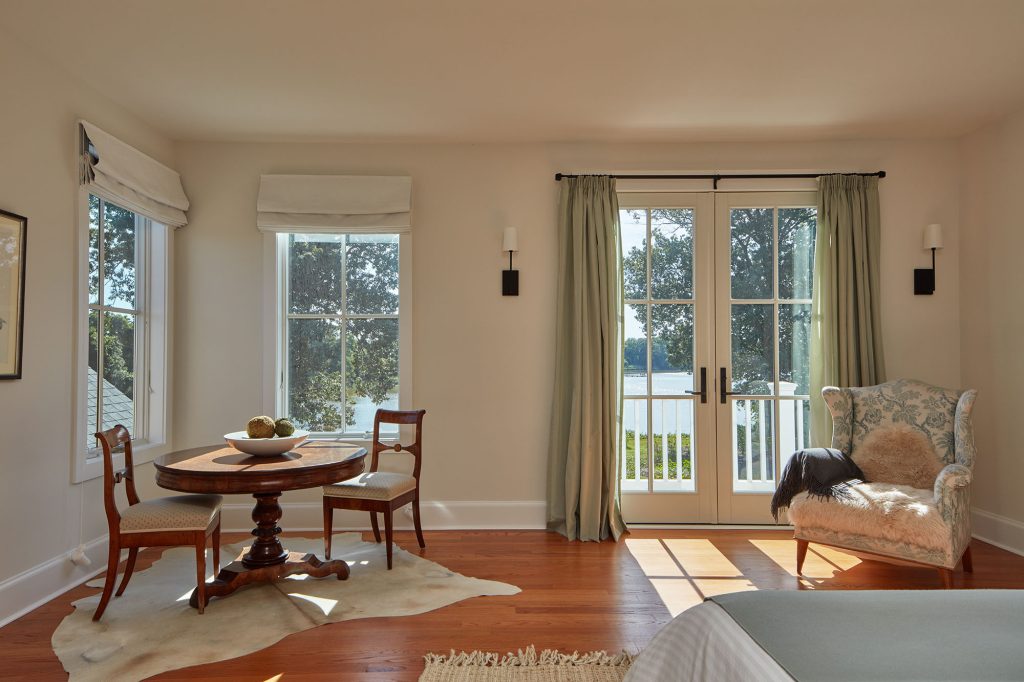 It’s true that the floor-to-ceiling windows along the hyphens that connect the wings to the main house aren’t in keeping with historical architectural tradition, but they enliven the space, bringing in plenty of natural light and providing breathtaking views of Reed Creek, which runs alongside the 22-acre property.