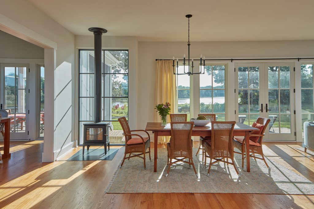 Even though 300 years have passed since the height of its popularity, Hansen points out that this architectural style is still relevant for a modern home. The design maximizes the home’s perimeter to get the most daylight and ventilation and sets the scene for an interior with an open floor plan where primary living spaces are all easily accessible. “I call it a modern farmhouse,” Hansen says, though she admits the home has modern touches that an 18th-century Tidewater Colonial would not. “Old farmhouses would not have this many windows, and the windows wouldn’t be floor-to-ceiling—so it’s a modernization.”
