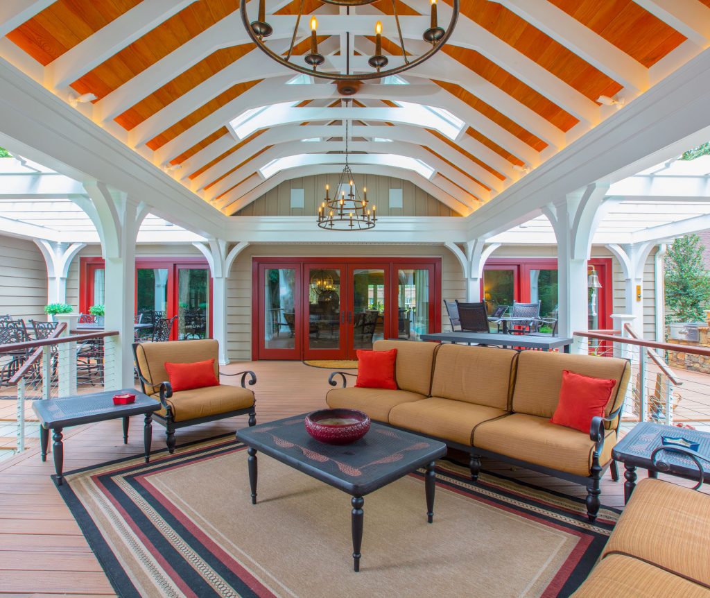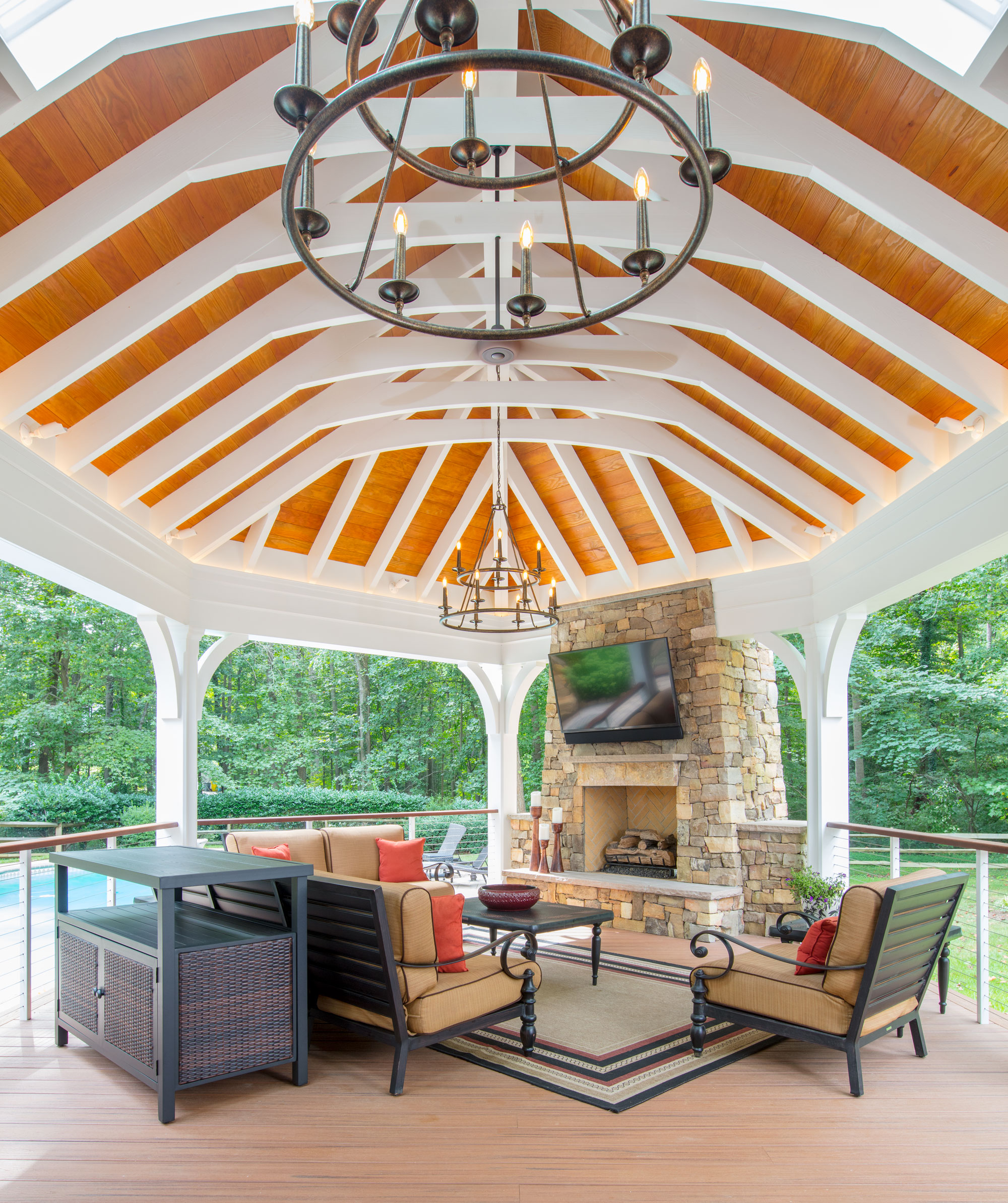 The Pizzis are both retired; Randy is a veteran of the US Navy. Their home in Davidsonville, Maryland, just a mile or two from the Chesapeake Bay, is where they plan to enjoy the rest of their lives. The home itself is ranch style with a warm, woody color scheme of reds, taupes, and grays, and a stone chimney that rises out of the roof. As they considered new plans for the porch, the Pizzis imagined a covered patio like an outdoor living room, with a TV, barbecue, and fireplace as focal points. “[The porch] had come to the end of its life,” says James N. Gerrety, the architect the Pizzis tasked with the renovation. Because of the home’s proximity to the Bay, and because Randy had served in the Navy, Gerrety envisioned a nautical feel and sketched an exposed roof with white beams, similar to the ribbed hull of a ship.