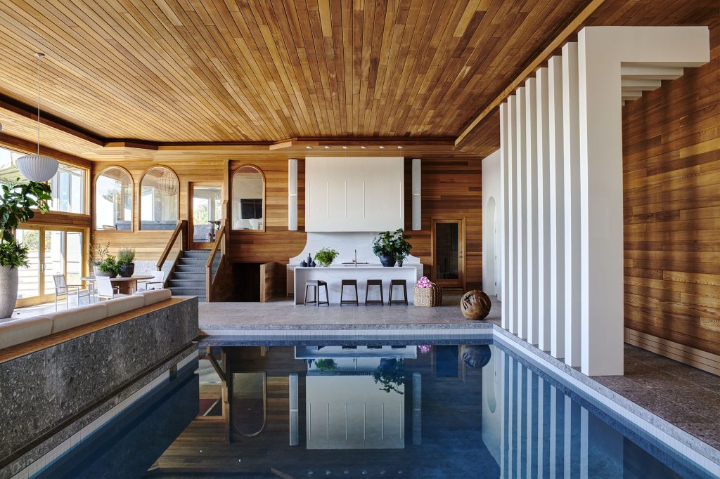 The first thing Sutton’s team did was sand down the walls revealing lighter and brighter wood beneath. The laborious task was time-consuming but well worth the effort, he says. Now in shades of caramel, the walls become a natural backdrop for the pool. What alters the room completely is a series of unusual “modern interventions” in the form of white plaster fins that protrude from the wall and ceiling. Introducing an element of art and surprise, the fins become a focal point in the vast room. “Sculptural elements break it down a little bit and provide interest. The fins add layers that you can walk behind and cast shadows and reflections into the pool,” he says.