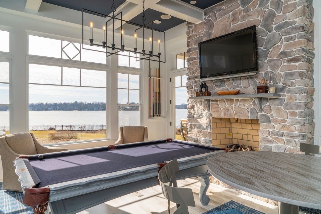 Fitzsimmons describes the former space as a traditional “man cave”—one the homeowner was reluctant to change until Fitzsimmons convinced him it would remain a favorite gathering spot. With his approval, she went to work. Dark cherry paneled walls were painted white. On the clean bright walls, nautical-themed photos by Annapolis’ own Jay Fleming were carefully positioned inside the raised paneled walls and trimmed with a one-inch “Hale Navy” pinstripe. The same navy is picked up as an accent color on the ceiling, whose recessed lighting is secondary to the copious natural light streaming in from the room’s ample windows. The bar provides not only a perfect view of the backyard; its two doors lead directly to the outdoor space.