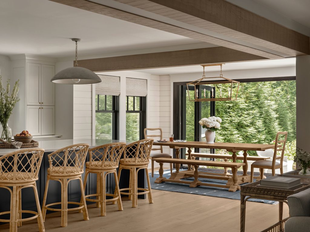 Subtle ceiling beams define each area without needing walls, and black-trimmed windows flood the space with natural light, creating a sense of warmth and openness. “I wanted to be able to fill my home with people and joy, and I needed a house that could do that,” says Cindy Childs. “So, the idea was to have an open floor that is really inviting to our guests.”