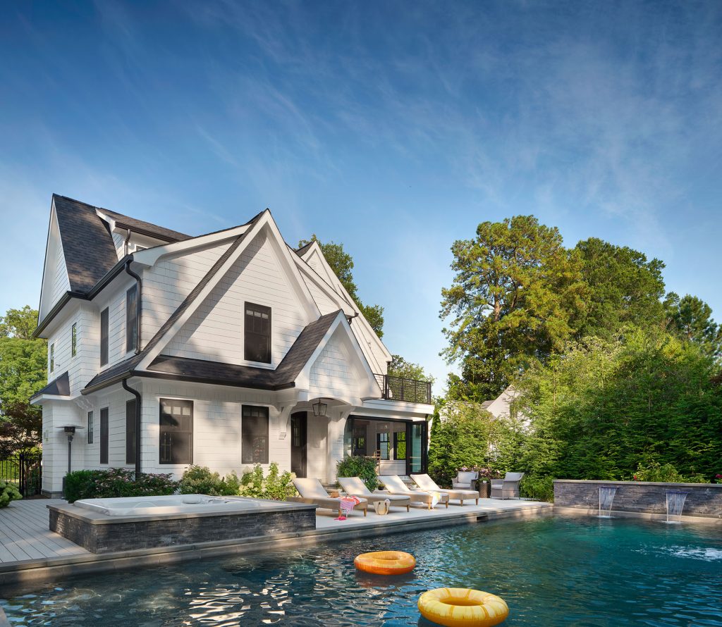 As one walks through the wide back doors, one is met with a pool deck and a lush landscaped backyard centered around a pool built by Larry Hyland and landscaping by Pendleton Outdoors.