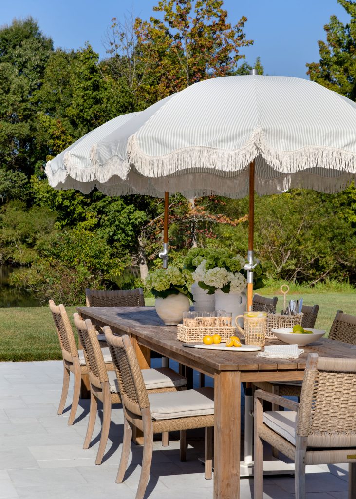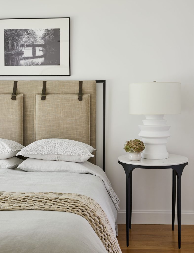 Even with a neutral palette, some bold statements are hidden away in surprising places. For example, glass mosaics adorn the wall in the moody blue bar room, and the quartz countertops are streaked with subtle blue veining. The master bedroom has a wallpapered accent wall that makes a big impact. Longchamps and Goebel’s bold design strategies have breathed new life into this older home—a life infused with beauty and mindful elegance one might experience while vacationing. Even outside, the teak furniture on the pool deck creates the ambiance of a luxurious resort.