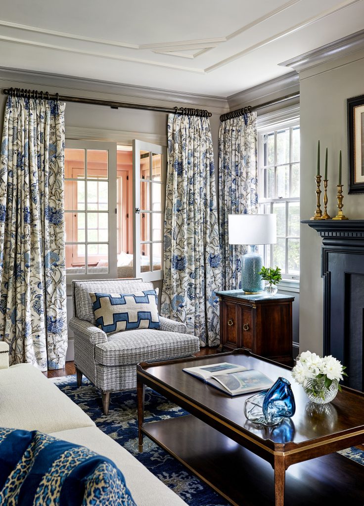 Similarly, the predominance of white in the kitchen feels clean and modern, but a colorful rug and Roman shades usher personality to the room. Textiles enliven the formal living room, where the rug served as a starting point for the rest of the design. Newman notes that the rug is traditional but not stodgy, and its dark color—which echoes the dark color of the restored fireplace—is offset by the light draperies, the off-white sofa, and the woven upholstery of the chairs.
